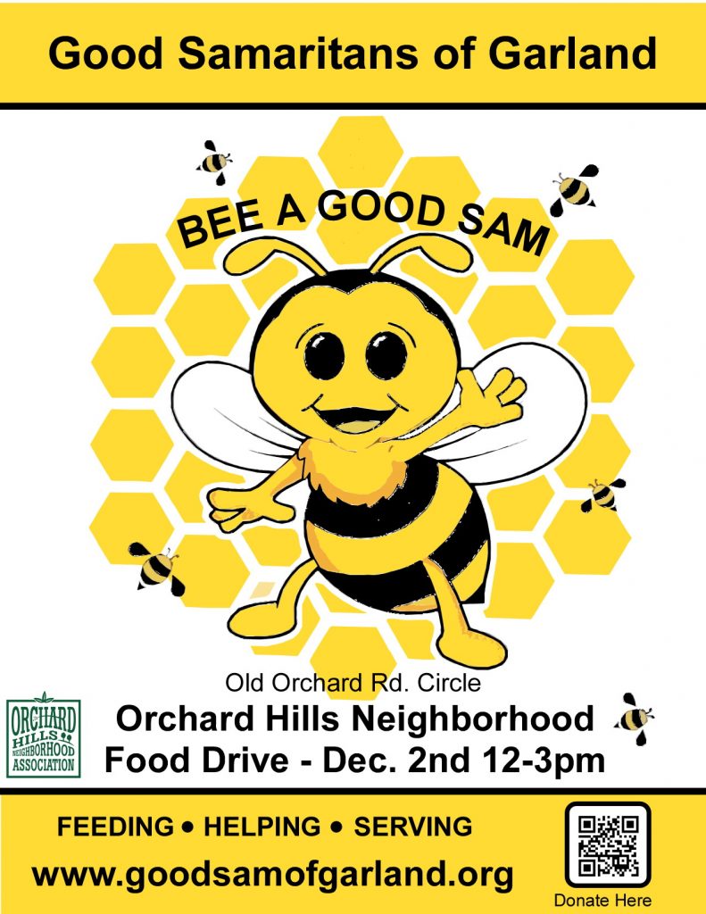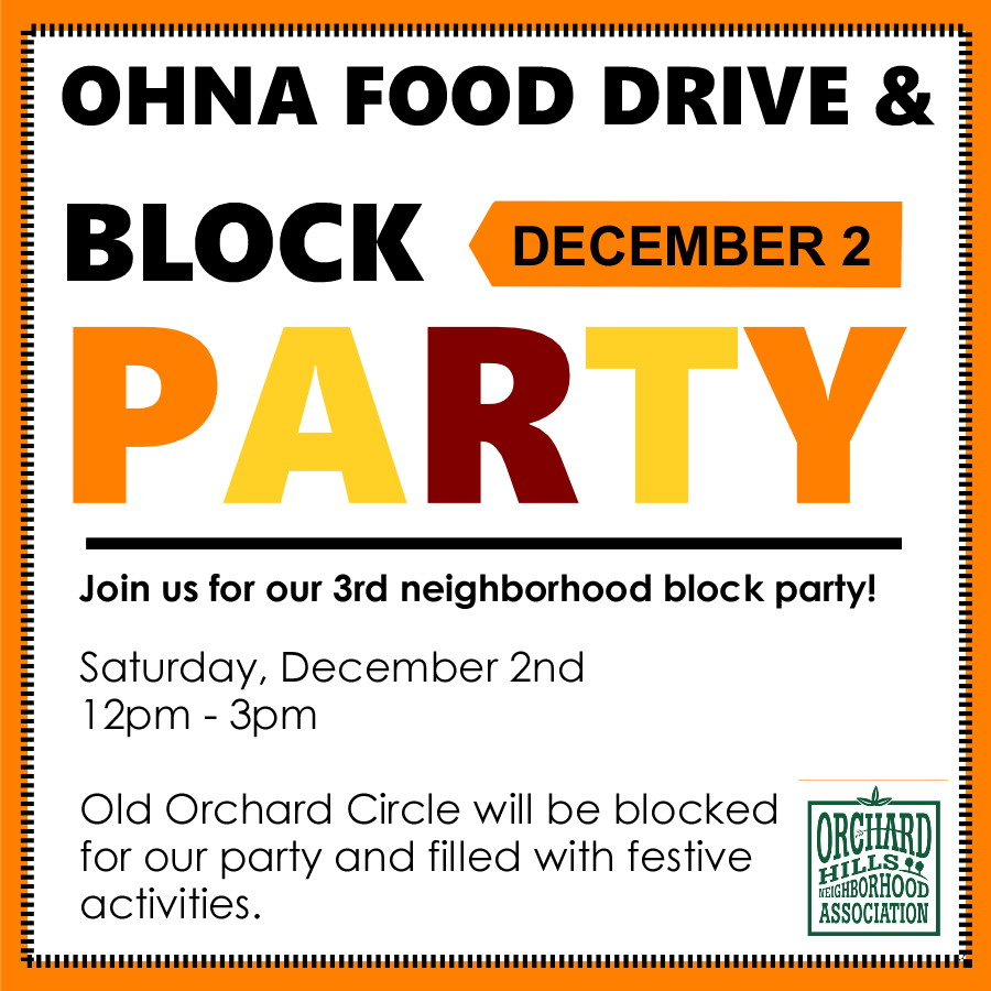 Come join your neighbors from 12 pm – 3 pm on Saturday, December 2nd for the block party, and/or drop food off for food drive. Everyone is invited.