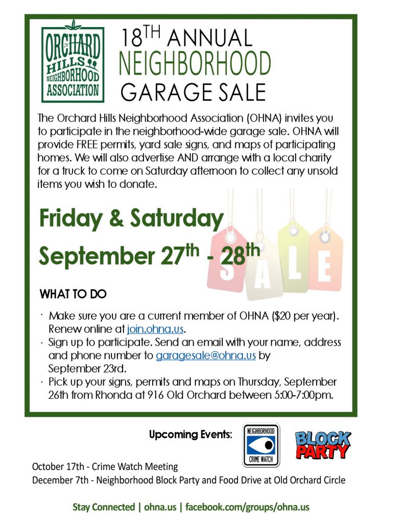 The Orchard Hills Neighborhood Association (OHNA) invites you to participate in the neighborhood-wide garage sale. OHNA will provide FREE permits, yard sale signs, and maps of participating homes. We will also advertise AND arrange with a local charity for a truck to come on Saturday afternoon to collect any unsold items you wish to donate.